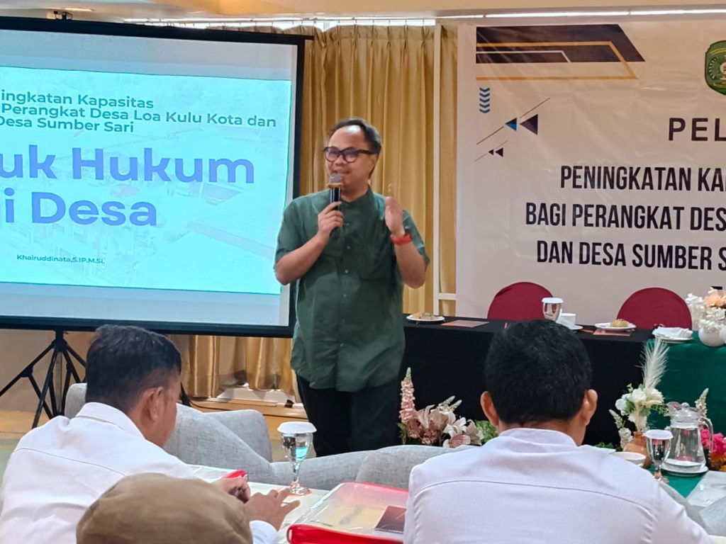 Plt. Sekcam Loa Kulu tidak hanya hadir, tetapi juga berperan sebagai narasumber dalam pelatihan tersebut. Ia memaparkan materi terkait dasar hukum pembentukan peraturan desa, tata cara penyusunan naskah akademik, mekanisme harmonisasi dan konsultasi, hingga proses penetapan dan pengundangan produk hukum desa. Penyampaian materi berlangsung interaktif dan disertai contoh kasus untuk memudahkan peserta memahami tahapan teknis.