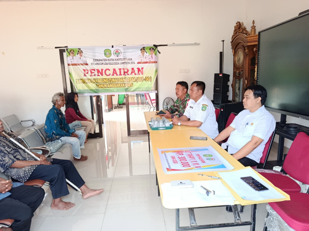 Loa Kulu – Pemerintah Desa Jonggon Jaya melaksanakan kegiatan penyaluran Bantuan Langsung Tunai Dana Desa (BLT-DD) untuk bulan 1, 2, 3, dan 4 Tahun Anggaran 2026. Kegiatan ini berlangsung di Kantor Desa Jonggon Jaya, Kecamatan Loa Kulu, dan berjalan dengan tertib serta lancar.
