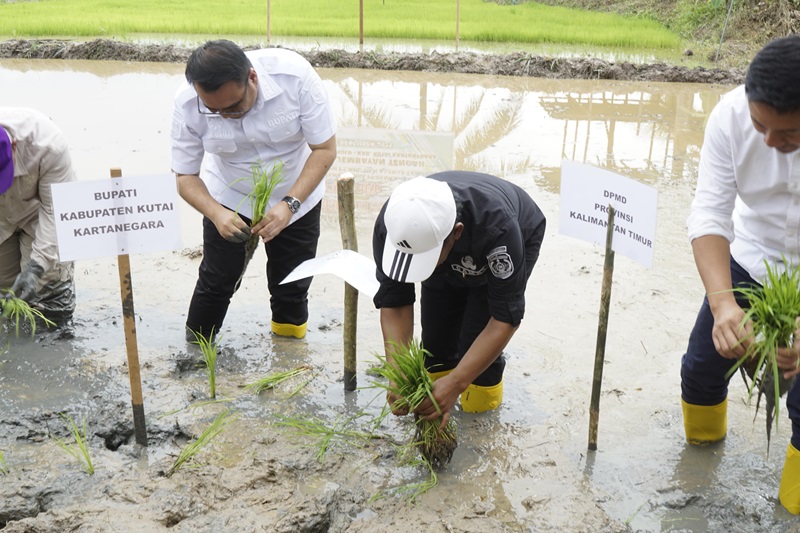 Agenda terakhir kunjungan kerja berlangsung di area persawahan Desa Jembayan Tengah. Dalam kegiatan ini, Bupati Kutai Kartanegara bersama Camat Loa Kulu serta BUMDes Bauntung Batuah melakukan penanaman bibit padi organik di lahan potensial seluas 100 hektare, yang merupakan program kolaborasi CSR/PPM PT MHU dan BAZNAS Tahun 2025.