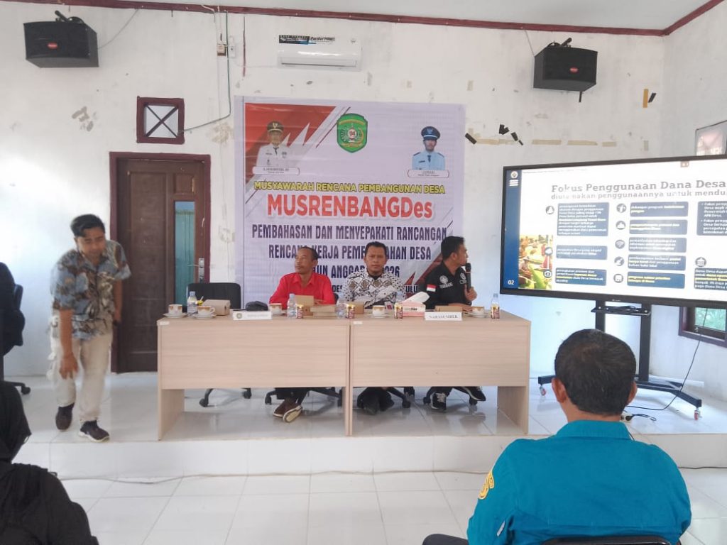 Musrenbangdes tersebut turut dihadiri oleh Plt. Kasi Pemerintahan Masyarakat Desa (PMD) Kecamatan yang memberikan arahan serta pendampingan teknis terkait penyusunan dan penetapan dokumen RKPDES. Dalam sambutannya, Plt. Kasi PMD menekankan pentingnya Musrenbang sebagai wadah partisipasi masyarakat dalam menentukan arah pembangunan desa secara terencana, terukur, dan sesuai prioritas kebutuhan warga.