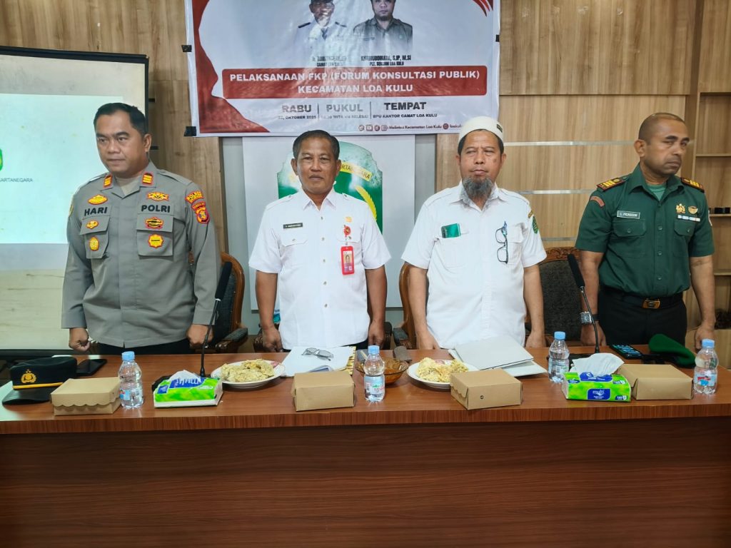 Loa Kulu — Pemerintah Kecamatan Loa Kulu menggelar Forum Konsultasi Publik (FKP) pada Rabu (22/10/2025) bertempat di Balai Pertemuan Umum (BPU) Kantor Camat Loa Kulu. Kegiatan ini dihadiri langsung oleh Camat Loa Kulu H. Adriansyah, S.H., jajaran pemerintah kecamatan, perwakilan desa, tokoh masyarakat, serta unsur lembaga dan organisasi kemasyarakatan.